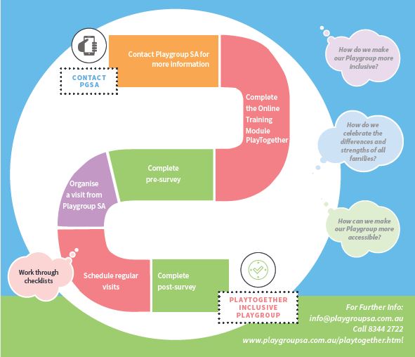 Currently, we have 5 Community Playgroups that are recognised as 'PlayTogether' Playgroups. All families are welcome at these Playgroups. Playgroup SA is continuing to work towards supporting as many Playgroups as we can to increase disability awareness and inclusive practices, and to become 'PlayTogether' Playgroups.